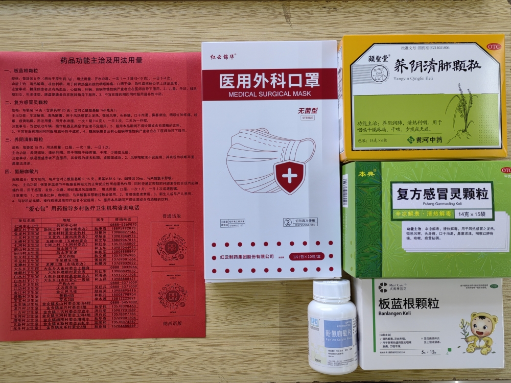 一心堂麗江連鎖店總經理周馳皓向記者介紹,“健康愛心包”內含板藍根顆粒、復方感冒靈顆粒、養(yǎng)陰清肺顆粒、酚氨咖敏片、醫(yī)用外科口罩等防疫物資,每份價值100余元,可滿足2至3人3天用量。