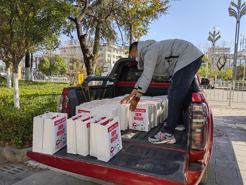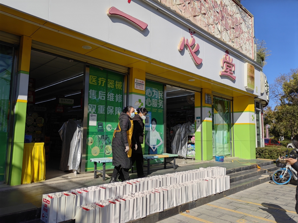 今天(1月3日)下午三點,記者在一心堂麗江祥和領域連鎖店門口看到,工作人員正在忙著裝車,一個個承載著滿滿愛心與溫暖的“健康愛心包”將會從這里出發(fā),送達困難群眾的手中。