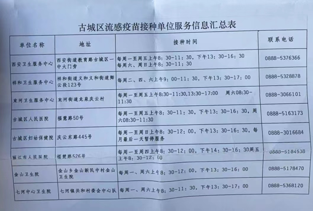 據(jù)了解,目前麗江市人民醫(yī)院、古城區(qū)人民醫(yī)院、古城區(qū)婦幼保健院,西安、祥和、束河社區(qū)衛(wèi)生服務中心流感疫苗庫存充足,大家可以根據(jù)接種時間自行前往接種。