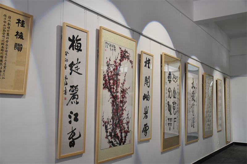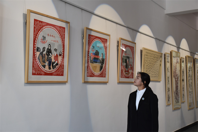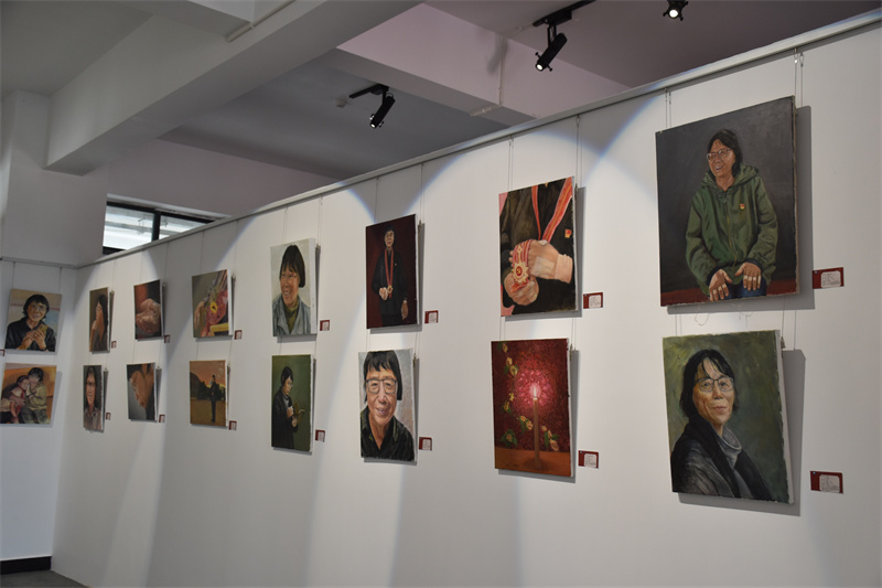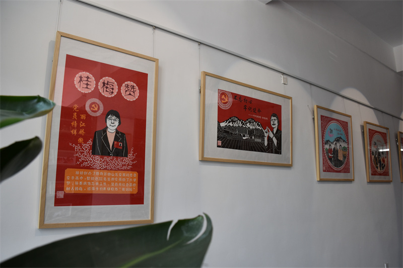 在傳承廳,展現(xiàn)的是麗江師專的師生們以張桂梅老師為主題創(chuàng)作的一系列作品,一幅幅有趣的剪紙作品和寫實的油畫都生動刻畫了張桂梅老師工作和生活中有趣的畫面。