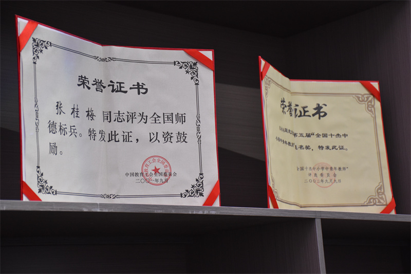 在主題廳和事跡廳展示了張桂梅老師的生平簡介和從教以來獲得的獎勵及榮譽(yù),同時展廳負(fù)責(zé)人還收集了張桂梅老師相關(guān)的書籍及她在麗江師專就讀時期的檔案和照片。