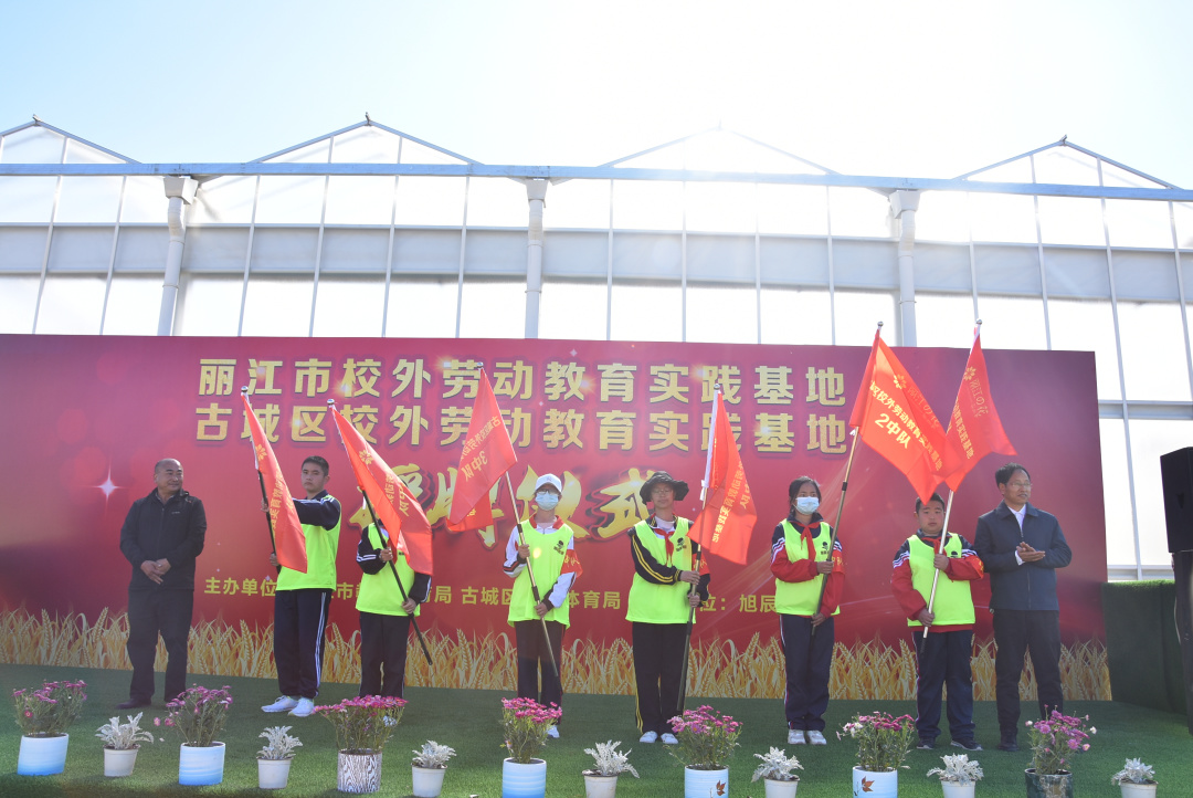 云南省教育科學(xué)研究院、云南省教育廳勞動教育專家,麗江市教育體育局、古城區(qū)相關(guān)負(fù)責(zé)人出席授牌儀式并發(fā)言,相關(guān)領(lǐng)導(dǎo)分別為麗江市校外勞動教育實(shí)踐基地、古城區(qū)校外勞動教育實(shí)踐基地授牌,向參加勞動實(shí)踐的同學(xué)們授勞動實(shí)踐中隊(duì)隊(duì)旗。