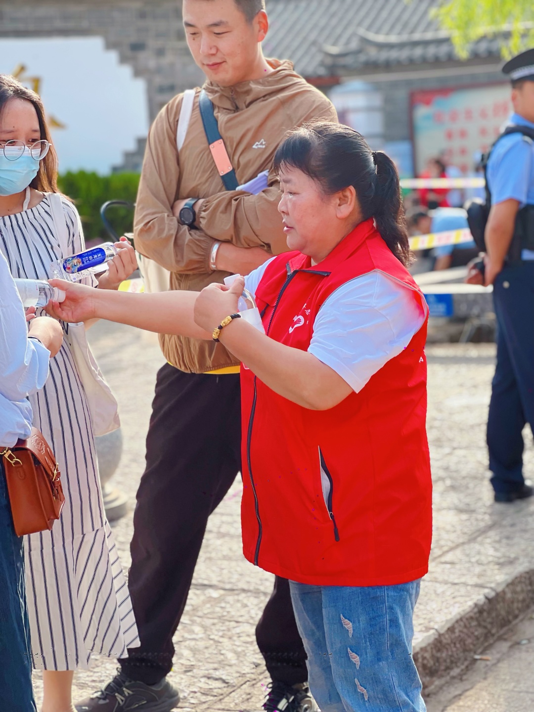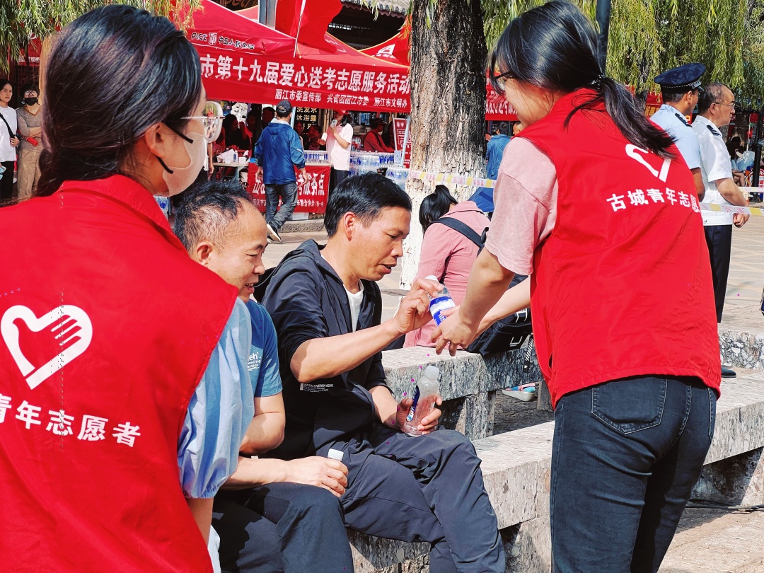 “全城高考”,暖心舉動遠不止這些,在麗江各個考點,志愿者們?yōu)榭忌⒓议L及考場工作人員遞上礦泉水,大家都希望為這場不見硝煙的“戰(zhàn)役”貢獻一份自己的力量。