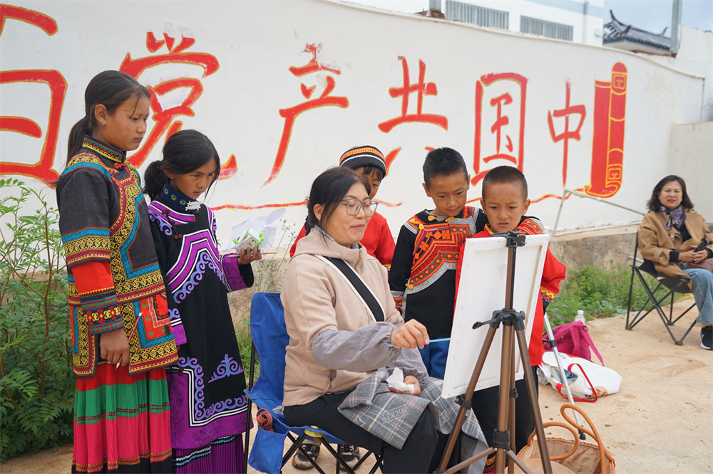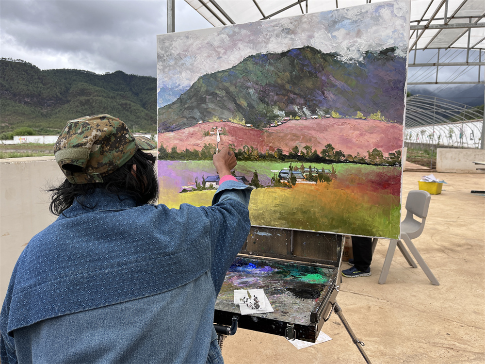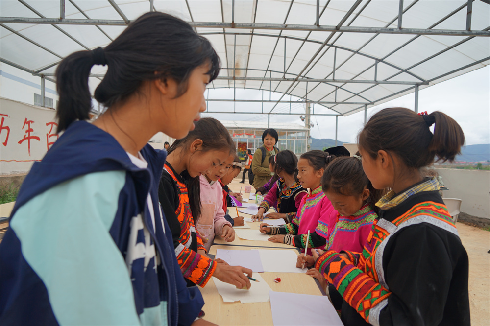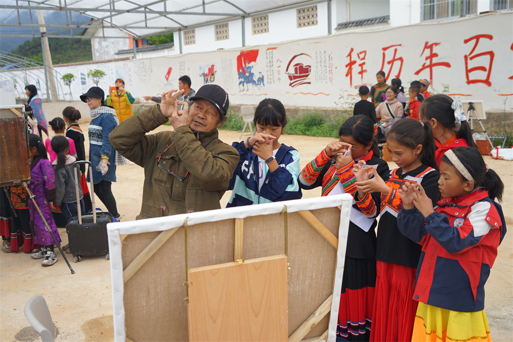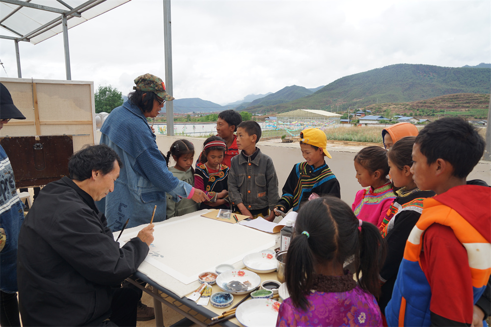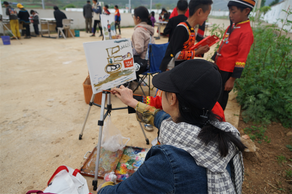 油畫家王韶悌介紹:“這次來(lái)參加活動(dòng)的有云南省的著名國(guó)畫家,云南藝術(shù)學(xué)院教授、國(guó)家級(jí)中國(guó)美術(shù)家協(xié)會(huì)的會(huì)員共12人,我們自行組織,驅(qū)車700多公里到寧蒗支持新星學(xué)校的教育。我們?cè)谑彝猱嬶L(fēng)景,邊繪畫邊代課教學(xué),傳達(dá)對(duì)美的一種教育,希望孩子們能有對(duì)美的一種感知,啟發(fā)他們熱愛(ài)繪畫,希望他們德智體全面發(fā)展?!?/p>