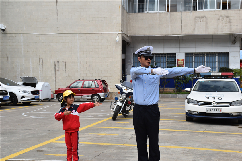 在進行現(xiàn)場體驗教學環(huán)節(jié)時,民警用標準的手勢對停止、直行、轉彎等常見交通手勢進行分解解說,一下子就吸引了所有小朋友的目光,孩子們眼里滿滿都是好奇和崇拜,在民警的鼓勵和手把手的指導下,小朋友們完成了每一個動作。