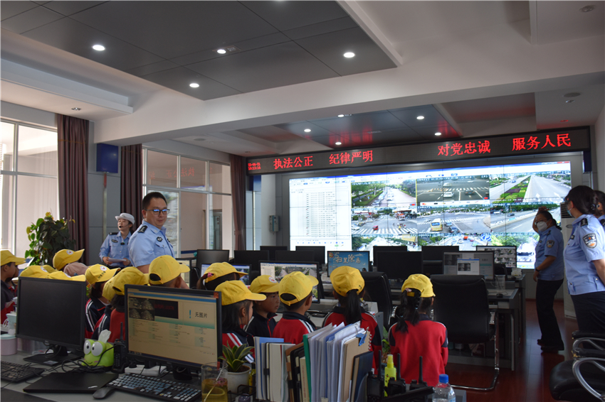 隨后小朋友們參觀了交警大隊各個部門,了解了各部門分工,在指揮中心參觀大屏演示過程時,“小交警”們驚嘆連連,看到屏幕中出現(xiàn)城區(qū)的各個路口時,興奮地說道:“看,我們幼兒園在這里!”