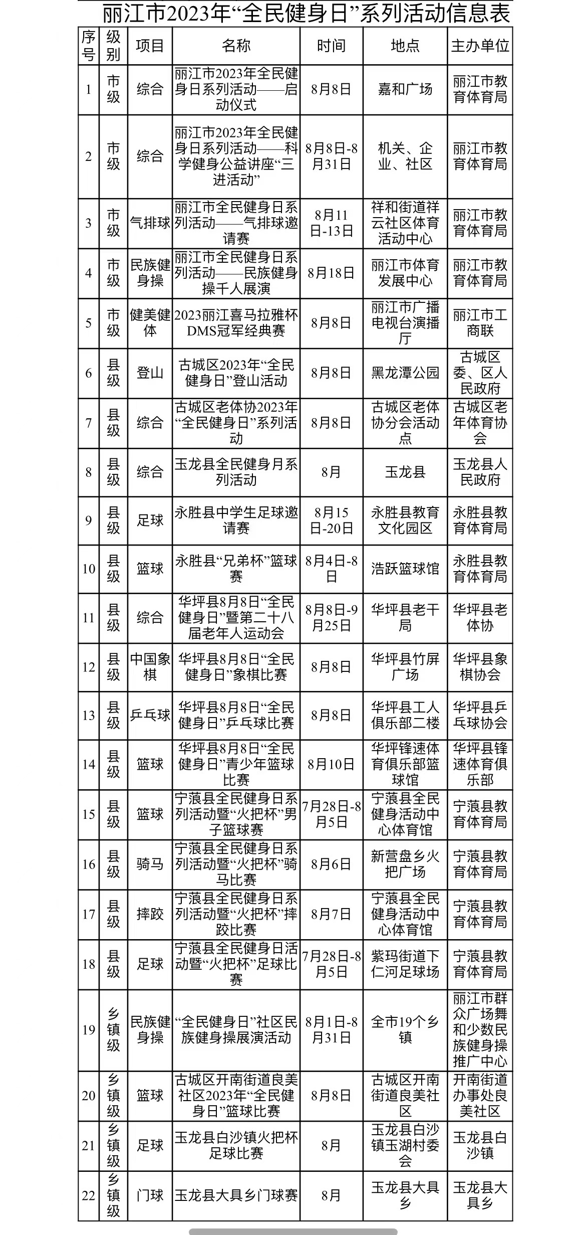 今天(8月8日),云南省2023年“全民健身日”和“體育宣傳周”系列活動(dòng)麗江分會(huì)場(chǎng)啟動(dòng)儀式在嘉和廣場(chǎng)舉行。本次活動(dòng)由麗江市教育體育局主辦,麗江嘉和集團(tuán)協(xié)辦,麗江市體育發(fā)展中心、麗江市老年人體育協(xié)會(huì)、云南省體彩中心麗江銷售部、麗江市群眾廣場(chǎng)舞和少數(shù)民族健身操推廣中心、麗江開艷松樂健身協(xié)會(huì)、麗江市運(yùn)動(dòng)康復(fù)中心協(xié)辦。