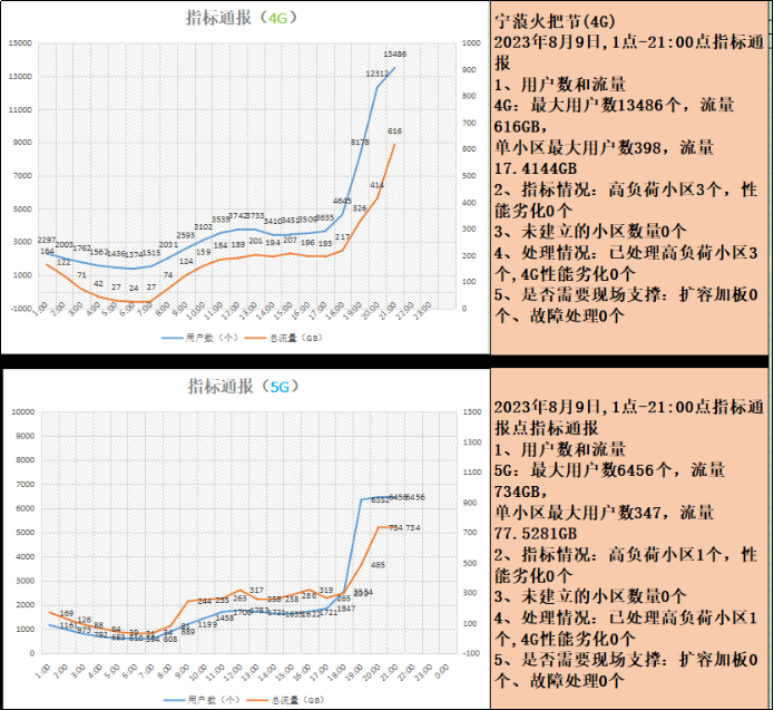 在8月9日的文藝晚會期間,場地內(nèi)外最高人流量超過了2萬,晚會場地內(nèi)4G峰值用戶數(shù)達(dá)到了13486戶,5G峰值用戶數(shù)達(dá)到6456戶,保障用戶約2萬人,現(xiàn)場無線通話正常,無線數(shù)據(jù)收發(fā)消息、圖片全程正常,無線直播測試全程正常,圓滿完成了保障任務(wù)。