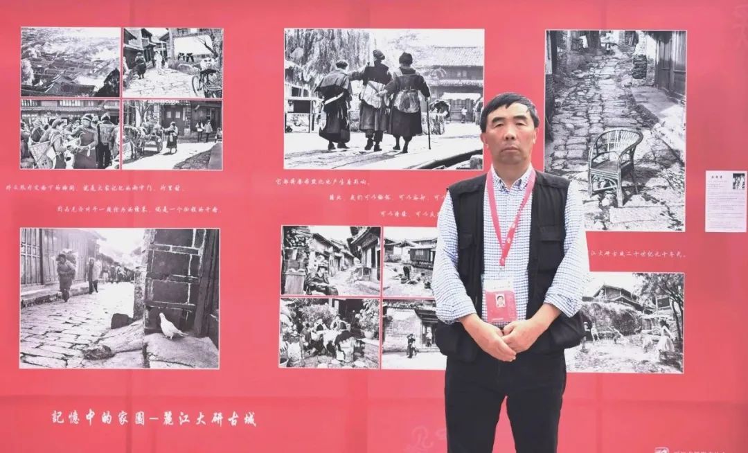 攝影師唐新華在作品前留影。(麗江融媒記者 趙慶祖 攝)