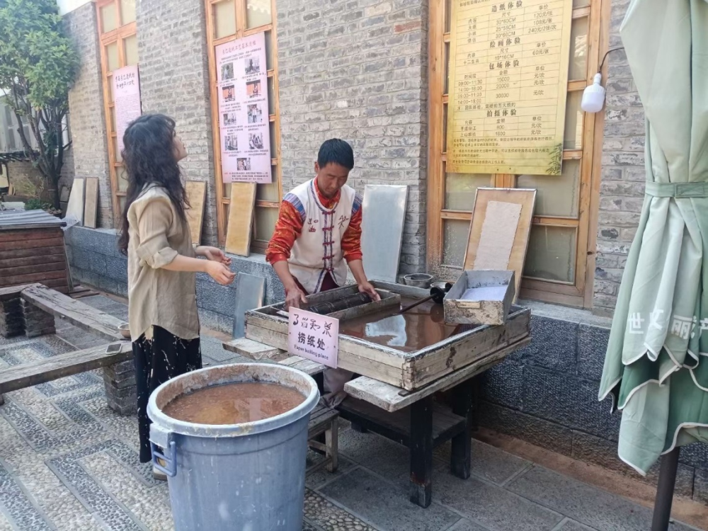 院子里,廣東游客李卓然正腳踩木碓,一點點將煮好的樹皮搗碎舂料。大約一刻鐘后,她將搗碎的木漿放入鐵桶容器中繼續(xù)攪拌打漿,再經(jīng)過抄紙、貼紙、晾曬等工序,一張耐火抗蛀、可存千年的東巴紙便在她手中做成?!暗谝淮尉嚯x國家級非物質(zhì)文化遺產(chǎn)這么近。與想象中的復(fù)雜相反,東巴紙造紙技藝簡單而生動,從碾磨蒸煮到過濾晾曬,每一步都帶著自然賦予的生機和力量?!崩钭咳槐硎荆粋€多小時就能造出一張可存千年的非遺作品,很有成就感。