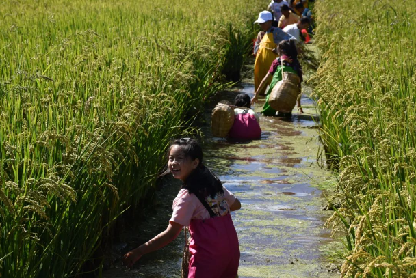 游客在拉市鎮(zhèn)均良村金黃稻田里捉魚。