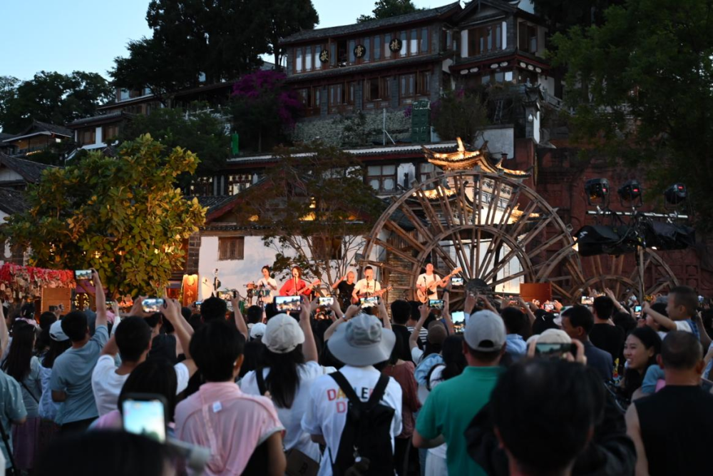 “為了聽他們唱歌,我專門從長沙過來?!爆F(xiàn)場一名游客激動地說。9月22日晚,麗江古城民謠廣場在四方街開唱,當(dāng)吉他聲、貝斯聲、鼓聲、歌聲交織著響起,在古城大街小巷的游客們向四方街聚集。臺上,酒吧樂隊輪番獻唱;臺下,游客們熱情洋溢,有的人高聲唱和,有的人隨著樂隊歌曲舞動,有的人拍照、錄視頻,有的人直播現(xiàn)場熱況。