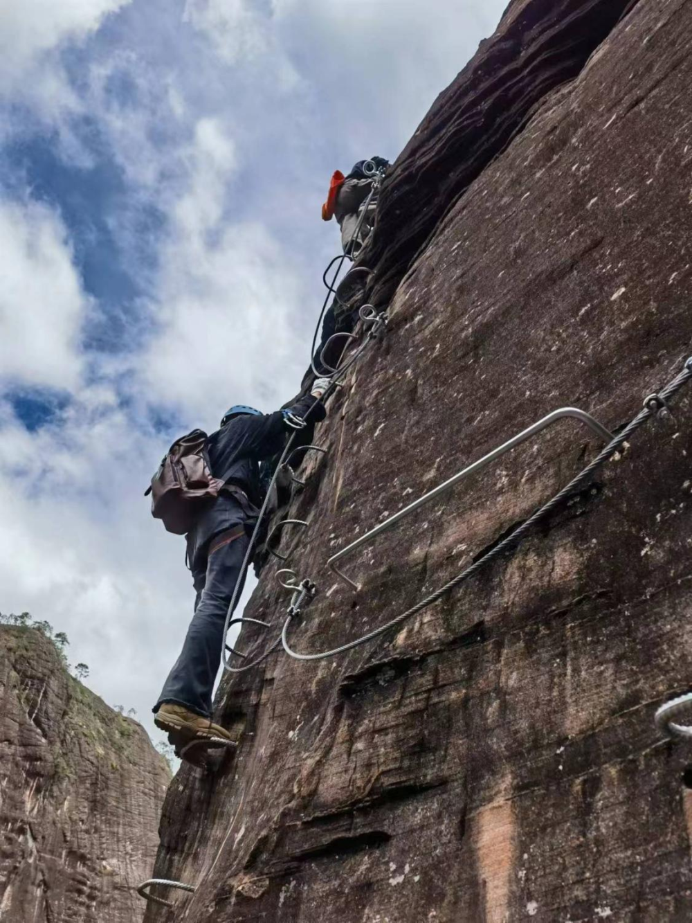麗江老君山位于“長江第一灣”西岸,境內(nèi)丹霞地貌、奇峰異石、碧湖清溪、高山草甸、冰峰奇峽等層出不窮,素有“滇省眾山之祖”之稱。依托地貌資源,老君山景區(qū)推出飛拉達攀巖項目。金屬扶手、鐵制橫梯、固定纜索、巖石塞等裝置牢牢嵌入巖壁,穿戴好腳蹬等專業(yè)設(shè)備的攀巖愛好者在陡峭的懸崖峭壁上攀登行走,既能飽覽山川河谷的雄奇險秀,又可感受心跳加速、腎上腺飆升的快感。