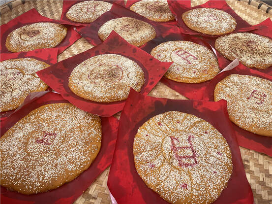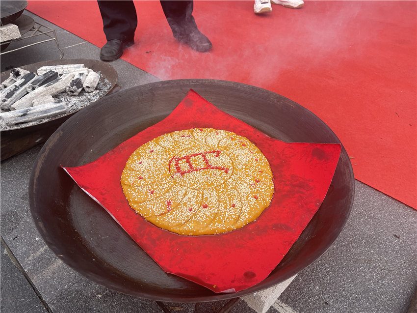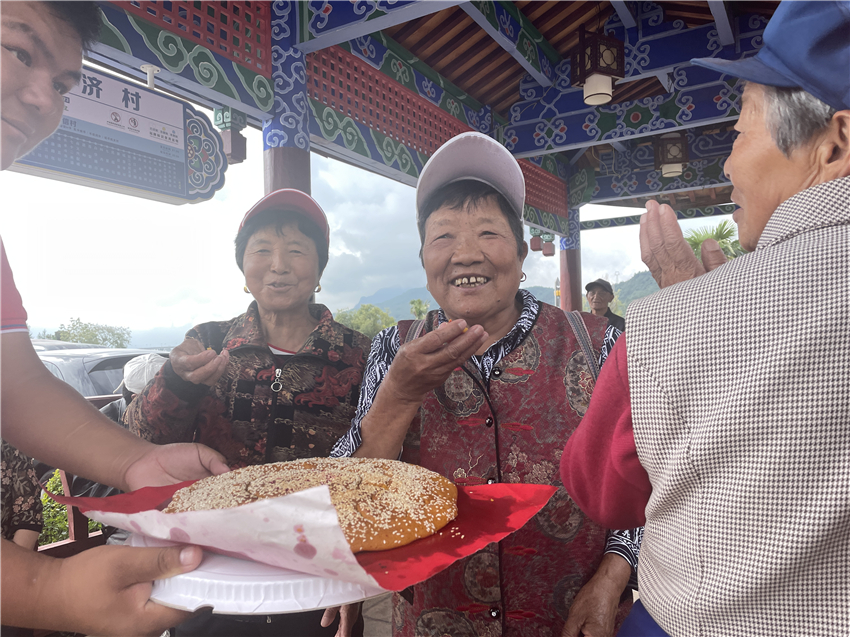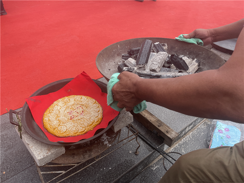 早上九點(diǎn),村民們身著傳統(tǒng)民族服飾相聚在普濟(jì)一組廣場(chǎng)上,燒起炭火、備好餡料、揉好面團(tuán),大家一起動(dòng)手,和面、填芯、做餅、烙紋飾、烤制,全場(chǎng)村民隨著歡快的音樂(lè)動(dòng)了起來(lái)。