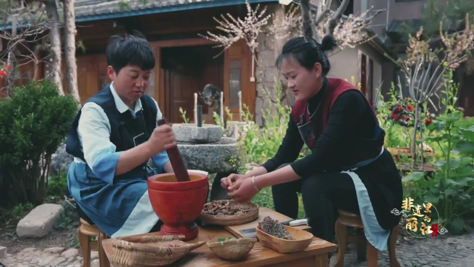 隨著麗江旅游業(yè)的發(fā)展,到玉龍村旅游的游客慢慢多了起來。村民制作的黃餅等一些傳統(tǒng)點心很受游客的喜愛。楊國芬的嫂子和汝菊,是村里有名的制作黃餅的高手。今天,楊國芬和嫂子、侄女一起制作黃餅。