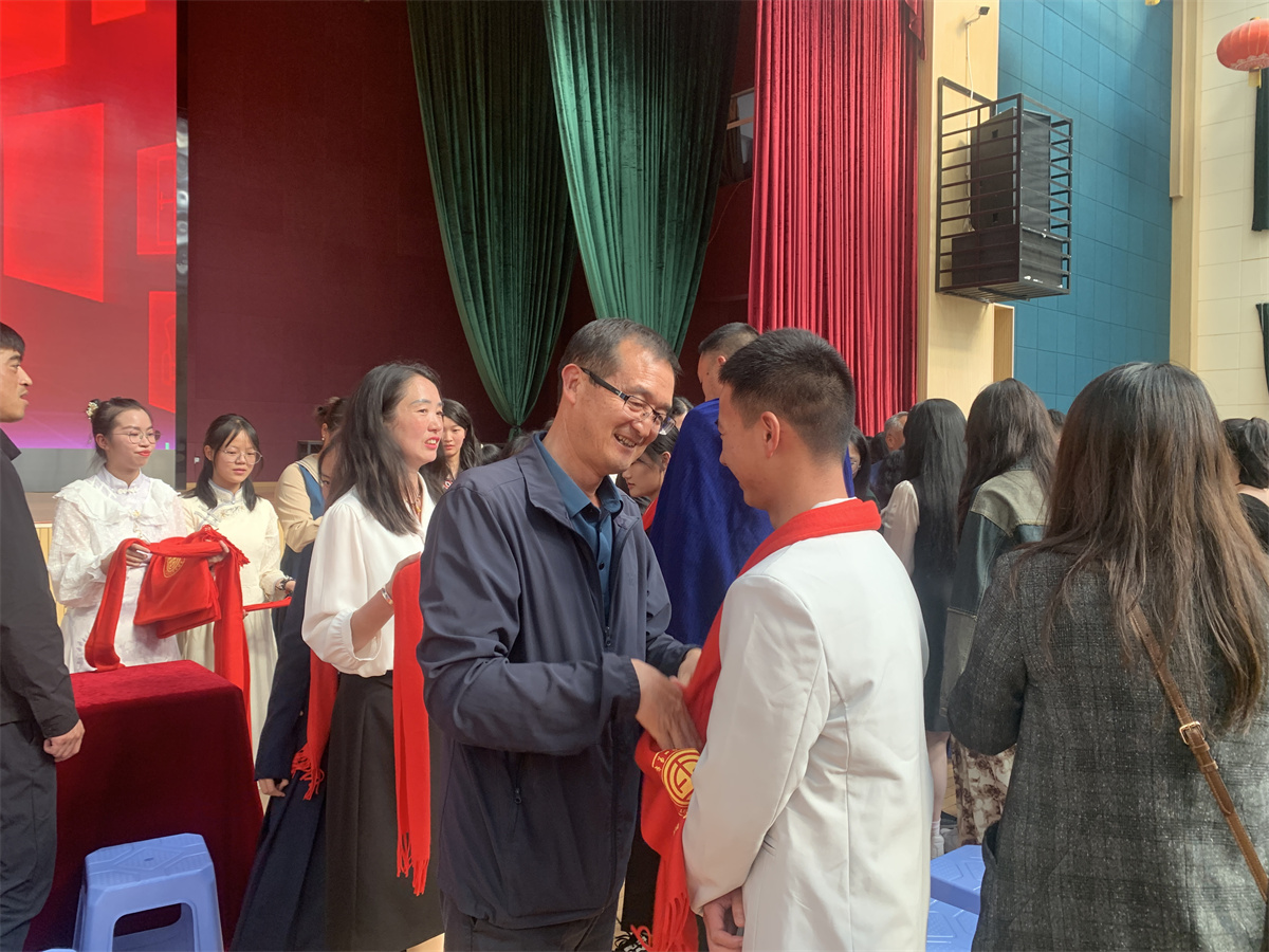 儀式現(xiàn)場(chǎng),同學(xué)們穿著隆重,在老師、家長(zhǎng)的陪同下一一舉行成人禮儀式。