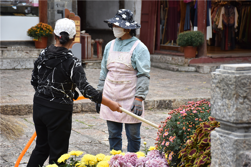 古城內(nèi)的鮮花綠草每天都有專門的工作人員進(jìn)行打理和管護(hù),鮮艷奪目的菊花在麗江的藍(lán)天白云下更加動(dòng)人,同時(shí)它們也像一面鏡子,折射出了旅游者的文明素質(zhì)。