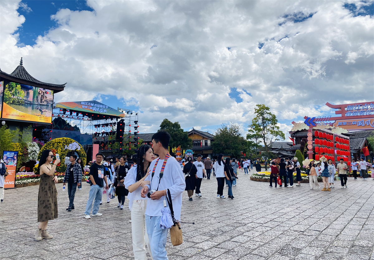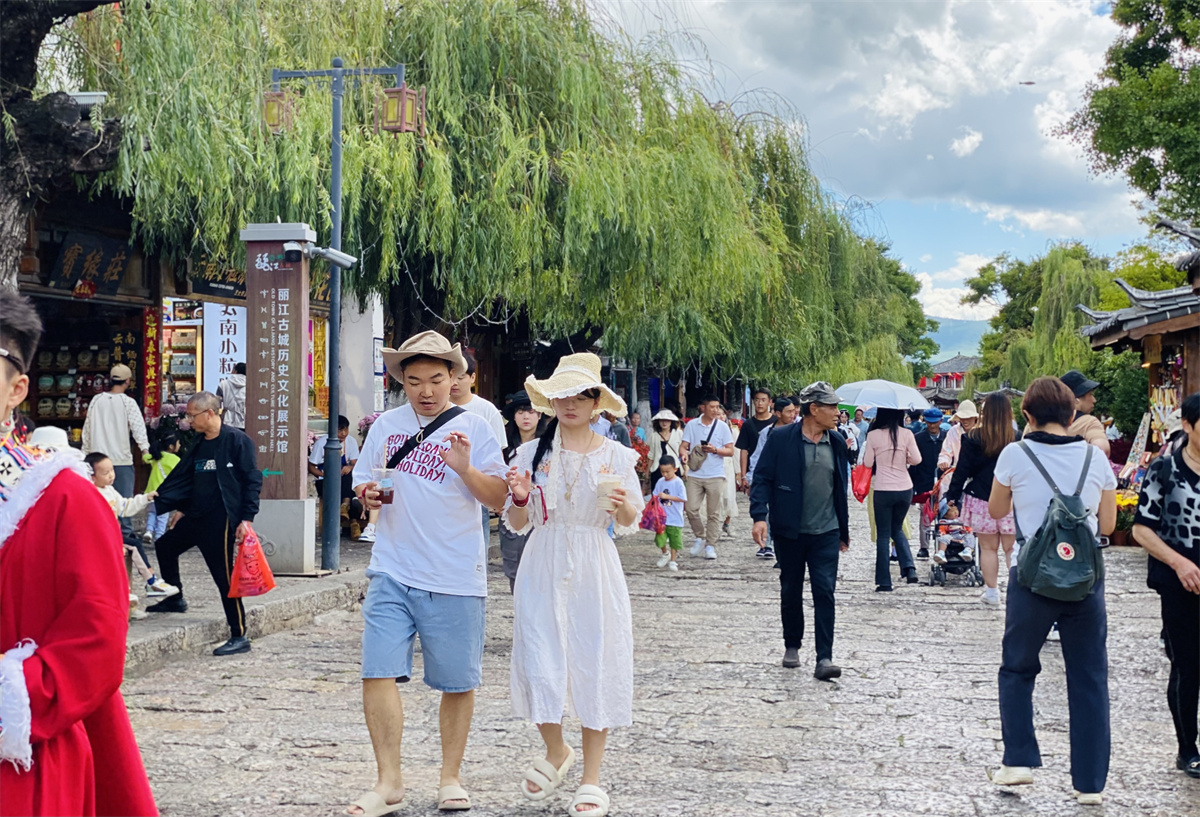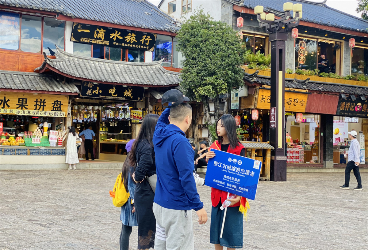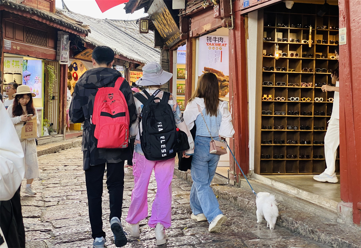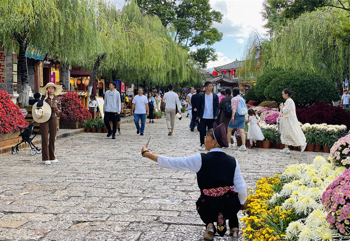 走進麗江古城,記者注意到旅游志愿者、環(huán)衛(wèi)工作者在引導著旅游行為,而游客朋友們也能自覺做到文明游玩,文明便在安全有序的環(huán)境里、在愛花只拍花的行為里、在共同享用的公共座椅里、在遛狗牽繩的細節(jié)里……