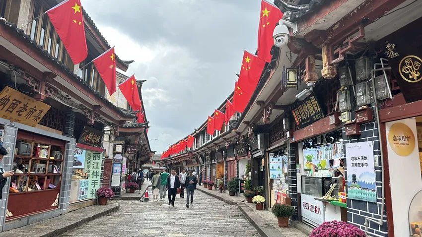 同時(shí),為喜迎國慶,營造麗江古城慶祝國慶節(jié)的濃厚氛圍,國慶前夕,麗江古城景區(qū)布置懸掛了3000余面4號國旗,懸掛位置:玉河廣場、東大街、四方街、新義街、五一街、新華街、七一街等,濃厚的節(jié)日氣氛貫穿麗江古城的大街小巷。