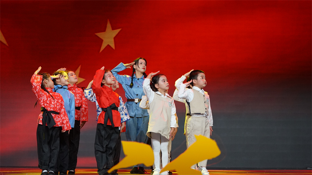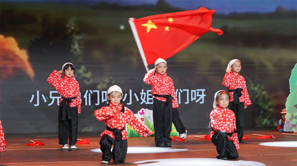 “《飄揚(yáng)的五星紅旗》是一部兒童歌舞劇,這部劇帶著孩子們追根溯源,穿越時(shí)空,回味那段崢嶸歲月。希望通過這次兒童劇活動,讓孩子們了解國旗的由來和抗?fàn)幹械挠⑿廴宋铮惺艿絿倚腋I畹膩碇灰?,激發(fā)了孩子們的愛國之情?!惫懦菂^(qū)新苗幼兒園老師方敏說道。