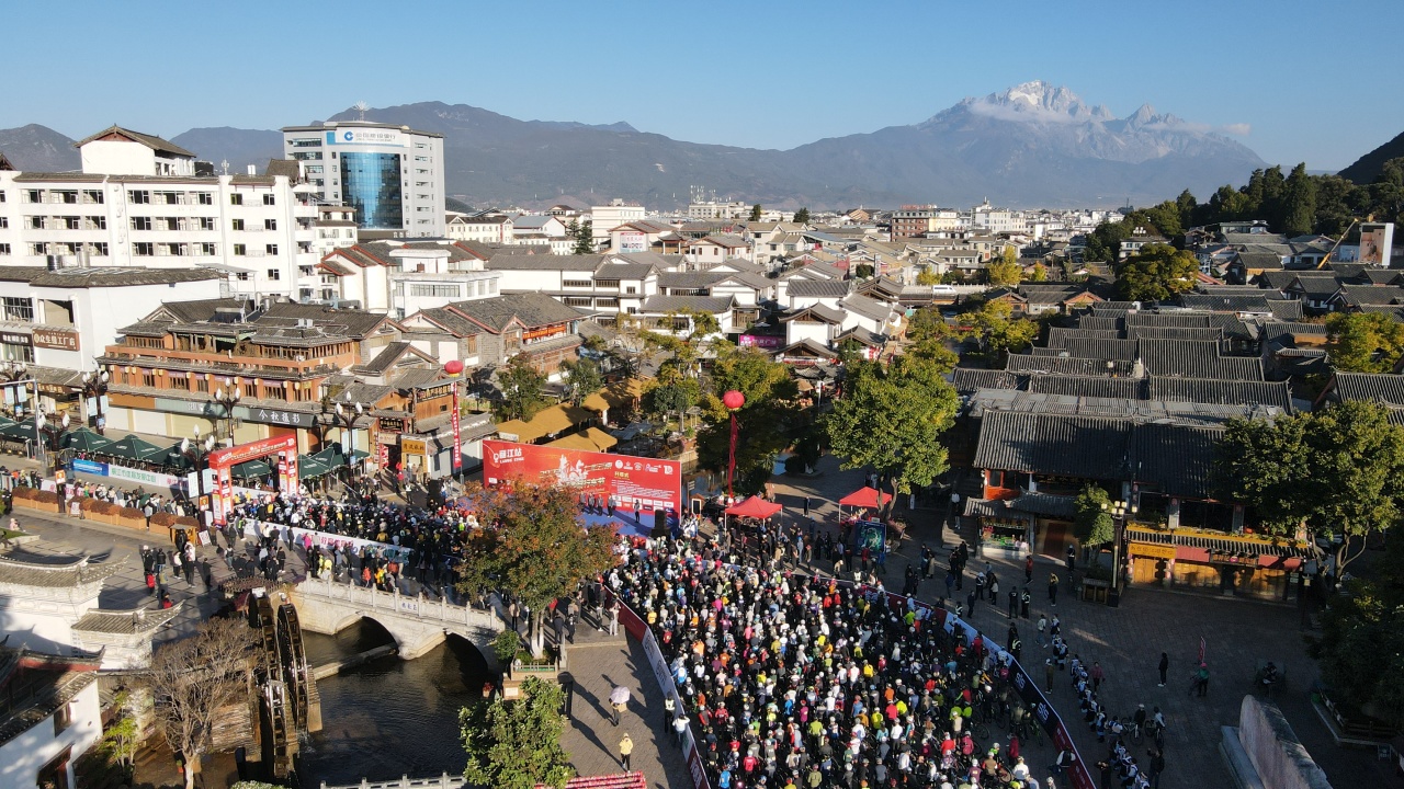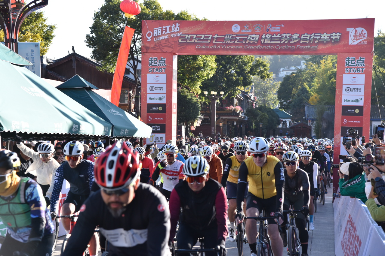 11月10日,2023“七彩云南·格蘭芬多”自行車節(jié)麗江站開賽。圖為比賽現(xiàn)場。(賽事方 供圖)