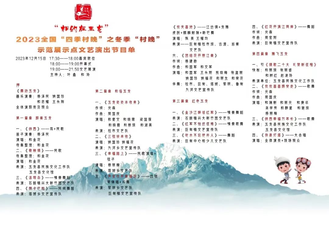 記者從發(fā)布會上獲悉,今年以來,文化和旅游部常態(tài)化開展春季、夏季、秋季、冬季“村晚”活動,玉龍縣被確定為全國冬季“村晚”示范展示點。經過前期緊張籌備,由文化和旅游部主辦,文化和旅游部公共服務司、全國公共文化發(fā)展中心、云南省文化和旅游廳、玉龍縣委、玉龍縣人民政府共同承辦的2023年全國“四季村晚”(冬季)玉龍縣示范展示活動將于12月15日在玉龍縣巨甸鎮(zhèn)舉辦。