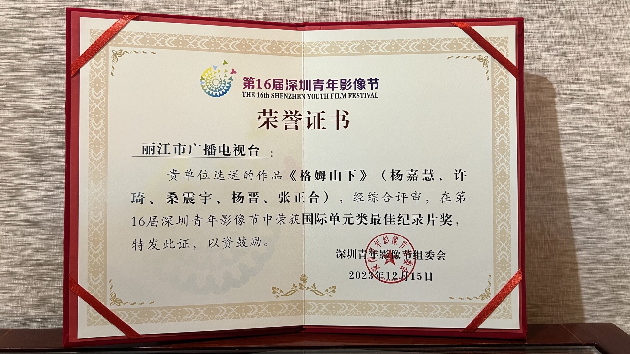 在2023年12月15日晚舉行的第16屆深圳青年影像節(jié)頒獎盛典中,由麗江市融媒體中心選送的紀(jì)錄片《格姆山下》榮獲國際單元類最佳紀(jì)錄片獎。