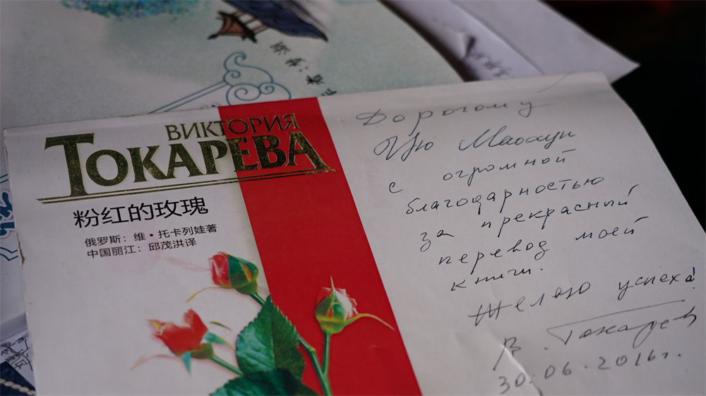 “在第二次的旅行中,我見到了傾慕已久的作家維克托利婭·托卡列娃,并與她進(jìn)行了深入交流。托卡列娃還將她的著作送給了我,留下了評價(jià)簽名,說我翻譯的作品很好、很準(zhǔn)確。這對我來說是極大的肯定,讓我有信心去翻譯好更多的作品。我還做了一本介紹麗江的圖冊,希望余生我還能把更多優(yōu)秀的俄羅斯文學(xué)帶給麗江,同時把麗江文化帶去俄羅斯!”邱茂洪告訴記者。