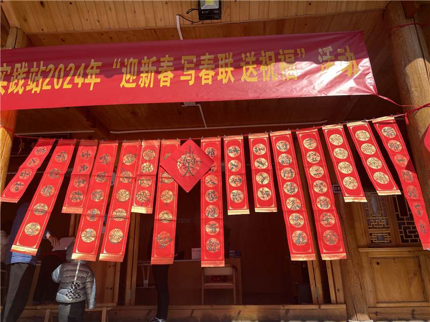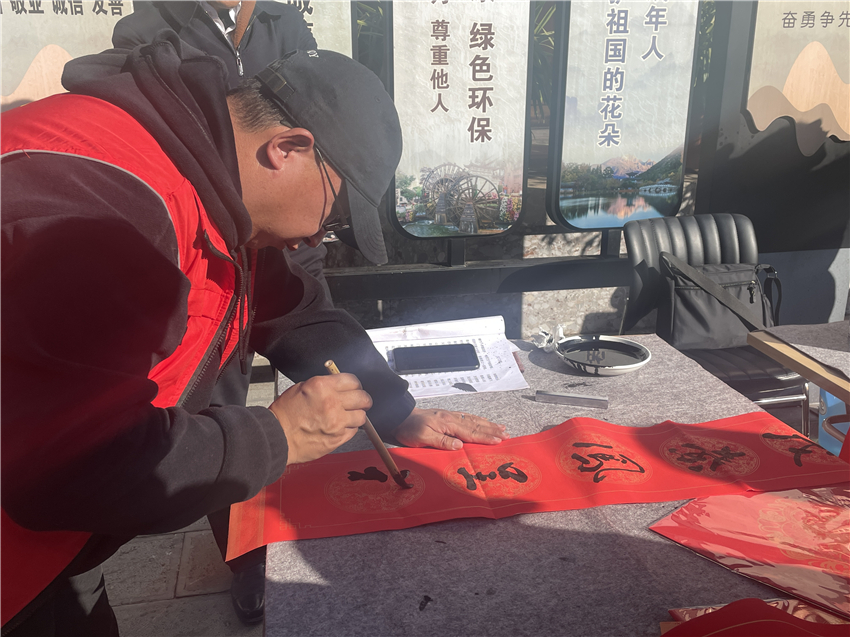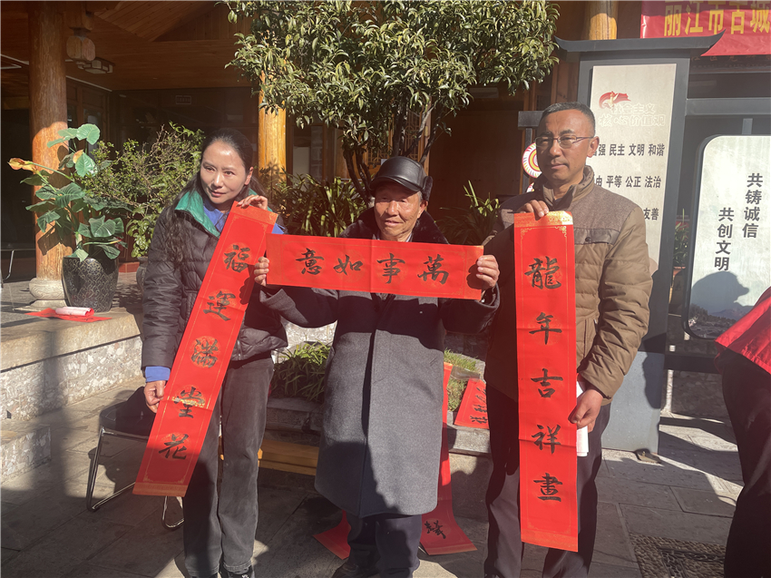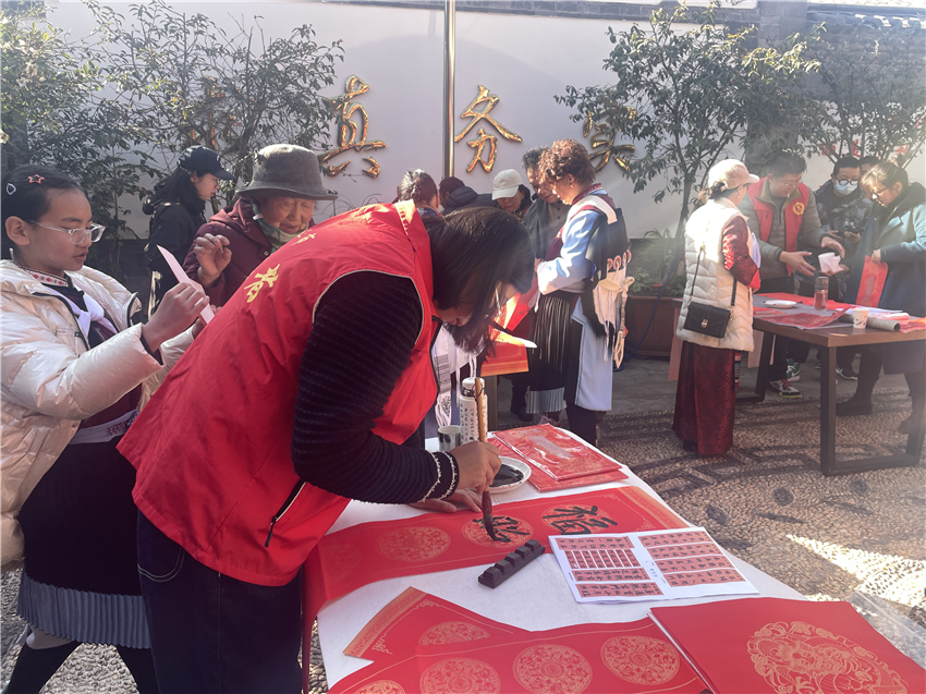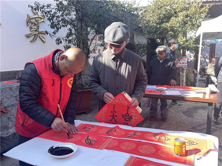 在五一社區(qū)居委會院內(nèi),來自共青團麗江市委、麗江市青少年宮、麗江市博物院的書法愛好者們紛紛揮毫潑墨,將一副副寓意吉祥、充滿祝福的春聯(lián)送到居民手中。