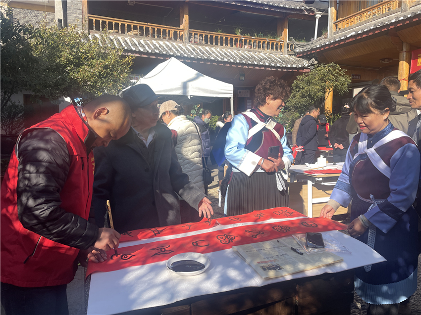 來自麗江市博物院的和麗寶正在書寫東巴字春聯(lián),他的身邊站滿了居民。“每年我們都會參加寫春聯(lián)送祝福的活動,今天書寫的都是東巴文當中一些表達祝福含義的金句名句,也是希望通過這樣的活動,能更好的傳承東巴文化?!焙望悓氄f。