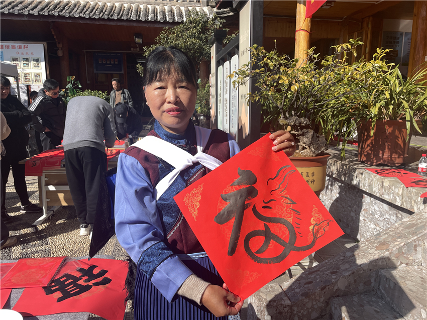 “今天特別請老師幫我書寫了這個‘福’字。這個‘福’字還是龍的造型。希望新的一年,大家都過得越來越好?!?span style="text-align: justify; text-indent: 32px;">居民趙麗娟說。