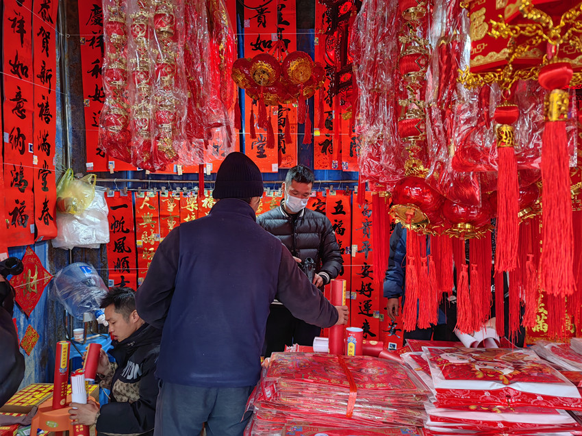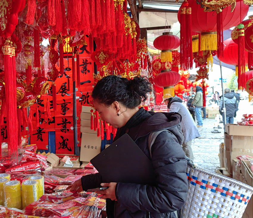 市場里大紅燈籠掛滿整條街,琳瑯滿目的年貨透著濃濃的新年氣息。市民和權(quán)正在挑選春節(jié)寫春聯(lián)的對聯(lián)紙,他說:“春節(jié)只有十多天了,麗江的風(fēng)俗是臘月就開始準(zhǔn)備年貨,我先來買一些?!?/p>