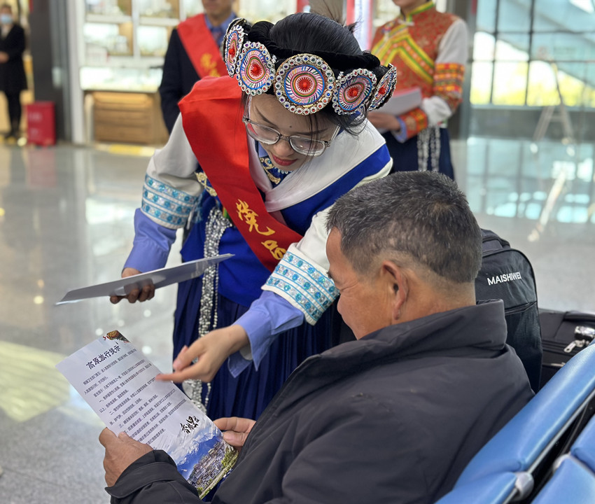 活動(dòng)現(xiàn)場(chǎng),服務(wù)隊(duì)隊(duì)員向前往香格里拉的旅客發(fā)放高原旅行提示宣傳單,為大家耐心講解預(yù)防高原疾病的相關(guān)知識(shí)。