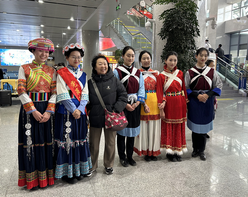 熱鬧的“納西三部曲”在候車廳奏響,身穿民族服飾的工作人員手挽手打跳,歡送旅客們回家。來(lái)自江蘇的陳先生告訴記者:“在麗江工作很多年,已經(jīng)很長(zhǎng)時(shí)間沒(méi)回去,沒(méi)想到今天回老家就趕上首日春運(yùn)的活動(dòng)!非常激動(dòng)!”