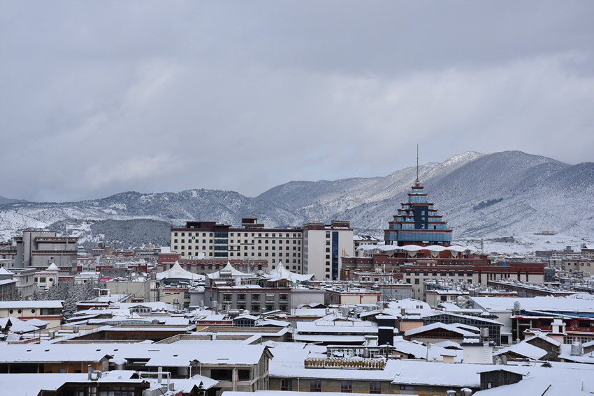 這個(gè)冬天,“美麗云嶺天路”采訪小組沐浴著冬日溫暖的陽(yáng)光漫步麗江古城,觸摸了800年風(fēng)雨歷練的人文之美后,從麗香鐵路起點(diǎn)站麗江出發(fā),奔赴香格里拉。我們站在龜山頂上,一覽落雪后美成詩(shī)的獨(dú)克宗古城。