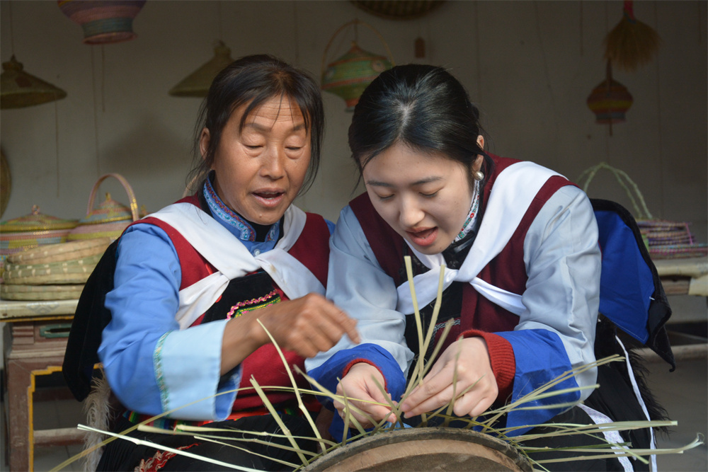 總臺記者向村民學習竹編(通訊員:和福天攝)