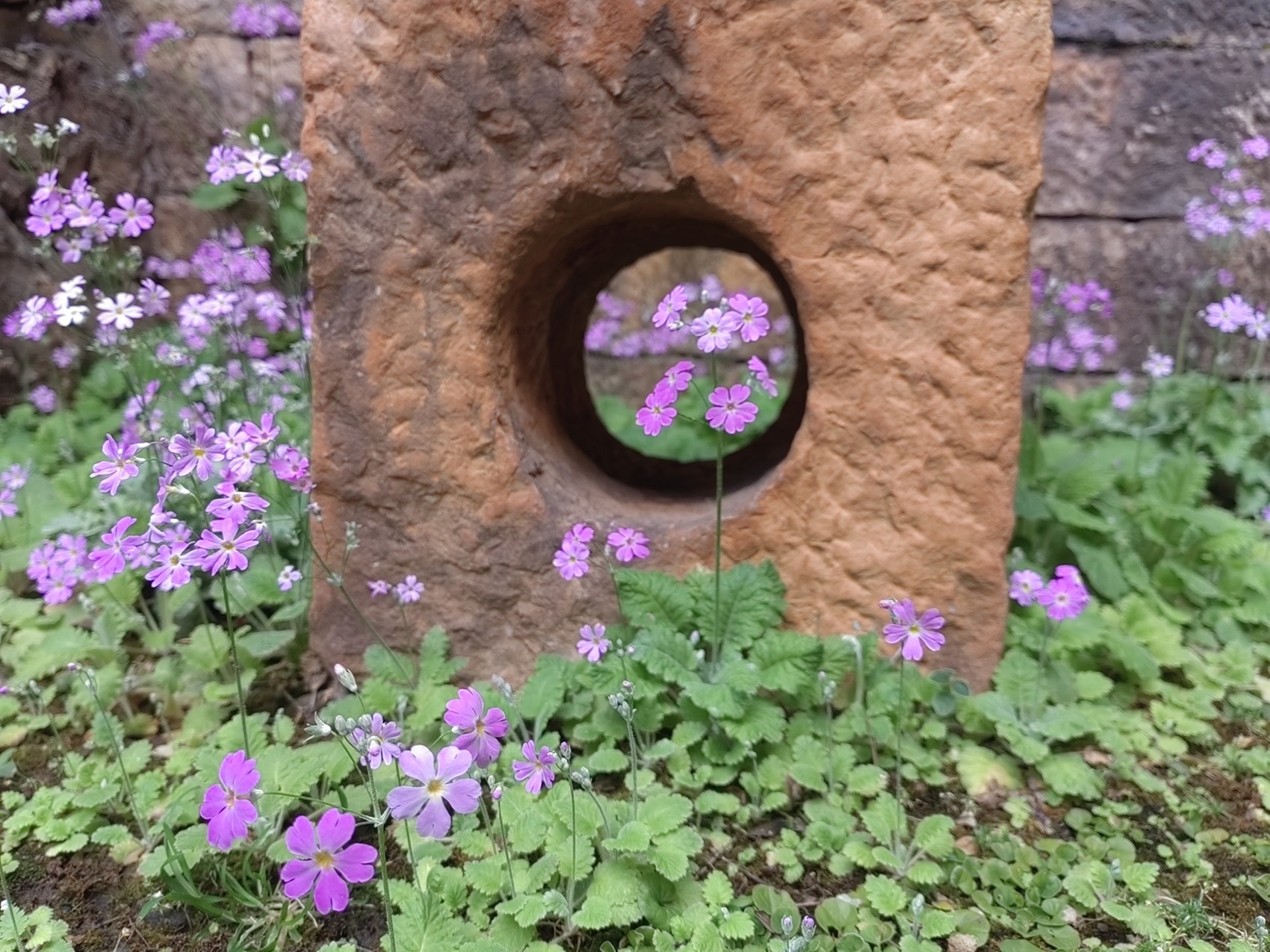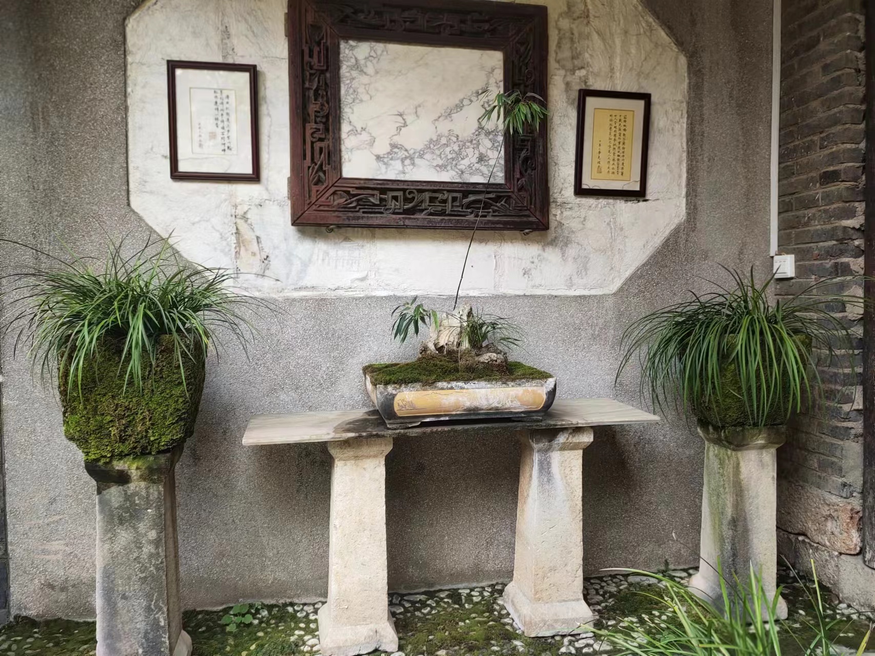 推開二道門,豁然開闊,目光立即被天井里盛放的報春花吸引了去,一株株、一叢叢粉紫的小花招搖晃漾著,直接迷離了人眼。而那一盆盆造型獨特的蘭花正盡情散發(fā)著沁人心脾的幽香,它優(yōu)雅飄逸的身姿和豐富多樣的瓣型,搭配著奇石、樹樁、盆景等,無不吸引著來自五湖四海的游人們駐足流連。