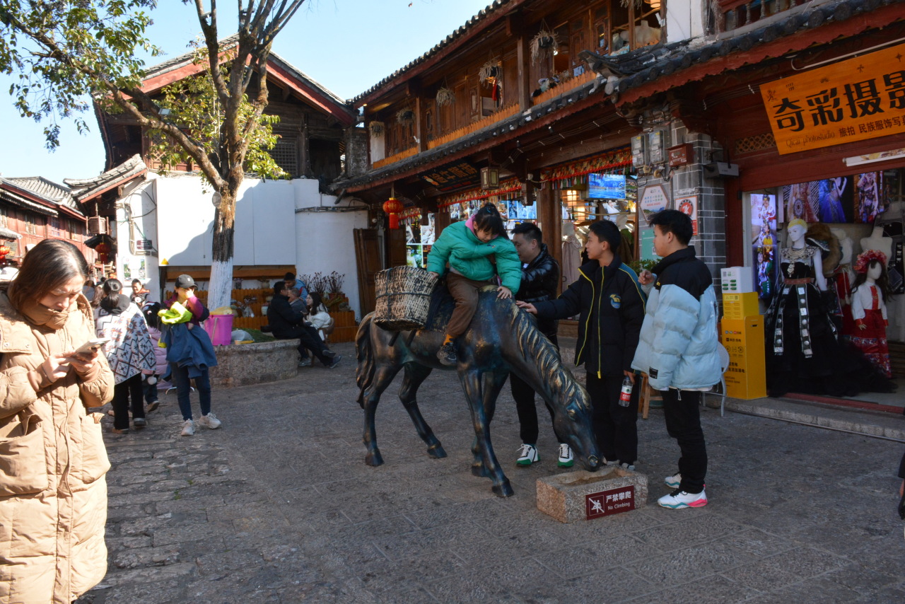 栩栩如生的雕像很受喜愛,游客紛紛與之合影拍照留念,雕像的顯眼位置處也設立了警示標識,但仍有部分孩子在雕像上任意攀爬打鬧,旁邊的大人也不制止。記者從麗江古城志愿服務站處了解到,很多雕像硬度高,不僅對小孩自身安全構成危險,而且隨意攀爬,容易對雕像造成人為性磨損。