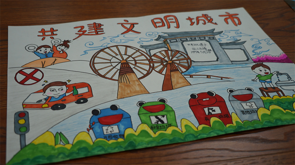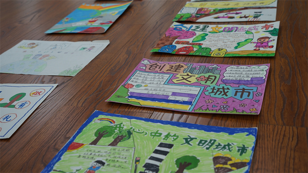 記者注意到,現(xiàn)場(chǎng)作品分為繪畫(huà)和手抄報(bào)兩類,孩子們結(jié)合日常生活中看到的文明行為、植被綠化、生態(tài)環(huán)保等作為創(chuàng)作素材,用畫(huà)筆描繪出一幅幅充滿童真、童趣的作品,詮釋了心目中的美好家園。他們眼中的文明城市是紅綠燈前的耐心等待,是垃圾入箱的清晰分類,是公共場(chǎng)合的社交禮儀,是藍(lán)天綠樹(shù)下的多樣生態(tài)……