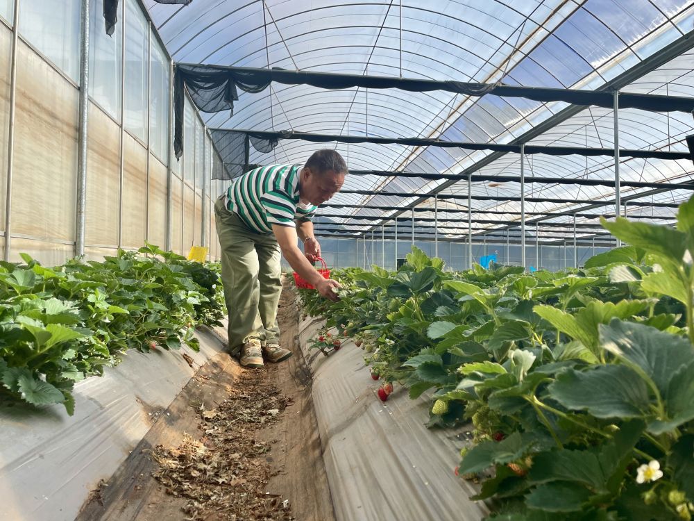七河鎮(zhèn)新民村委會(huì)龍興村草莓種植戶和強(qiáng)在采摘草莓。(楊四見 攝)