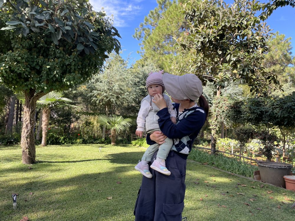 來自浙江的客人柯姍姍與孩子在村里散步。(楊四見 攝)