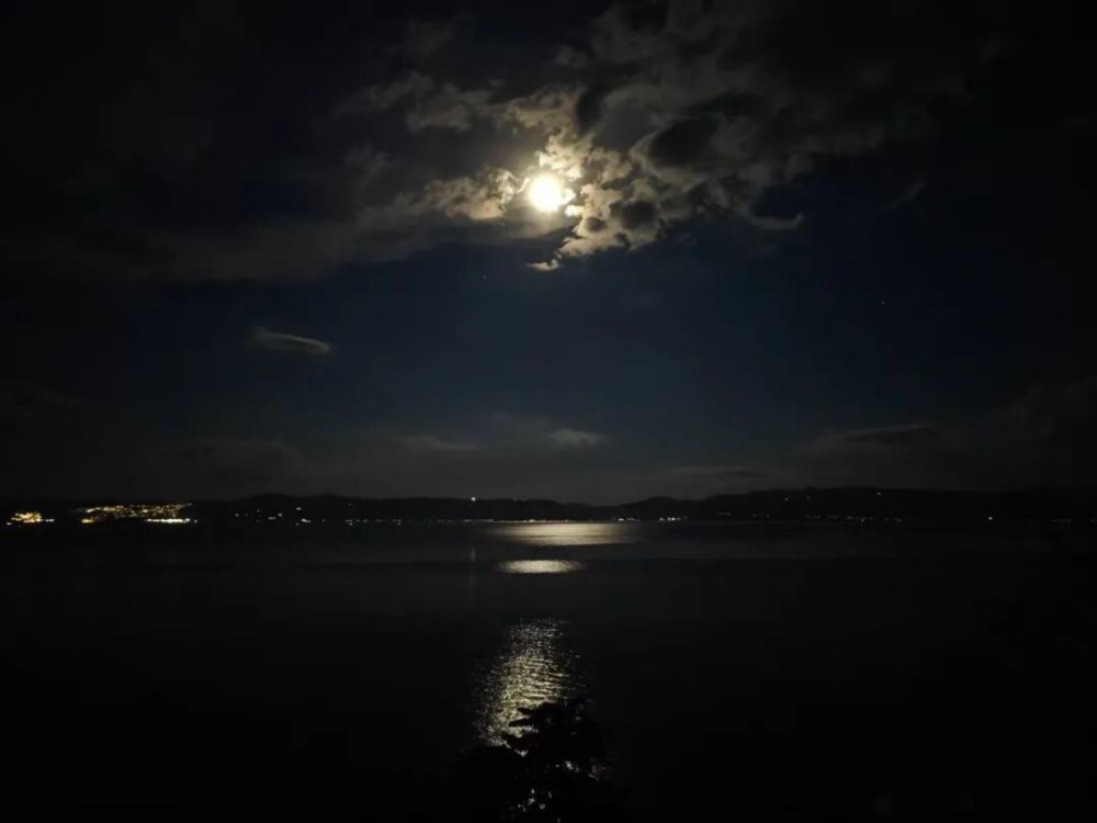 大理白族自治州洱海的夜,風(fēng)靜浪平。月從蒼山背后升起,緩緩沉入水中,天上一個(gè)月亮,水里一個(gè)月亮,仿若雙生。