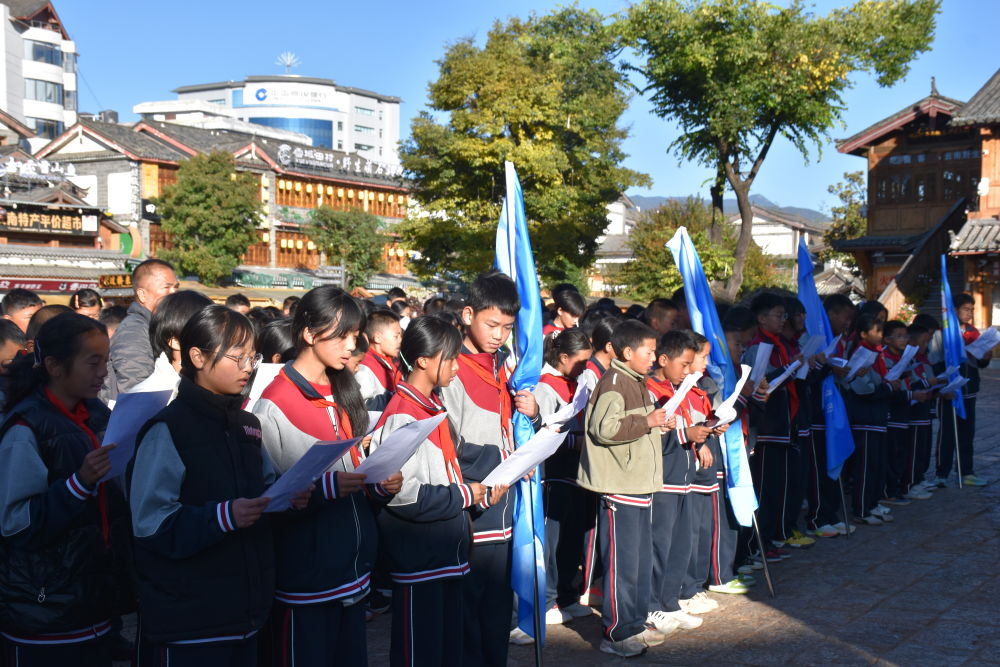學(xué)生在玉河廣場誦讀《一滴水經(jīng)過麗江》。(麗江融媒記者 楊四娟 攝)