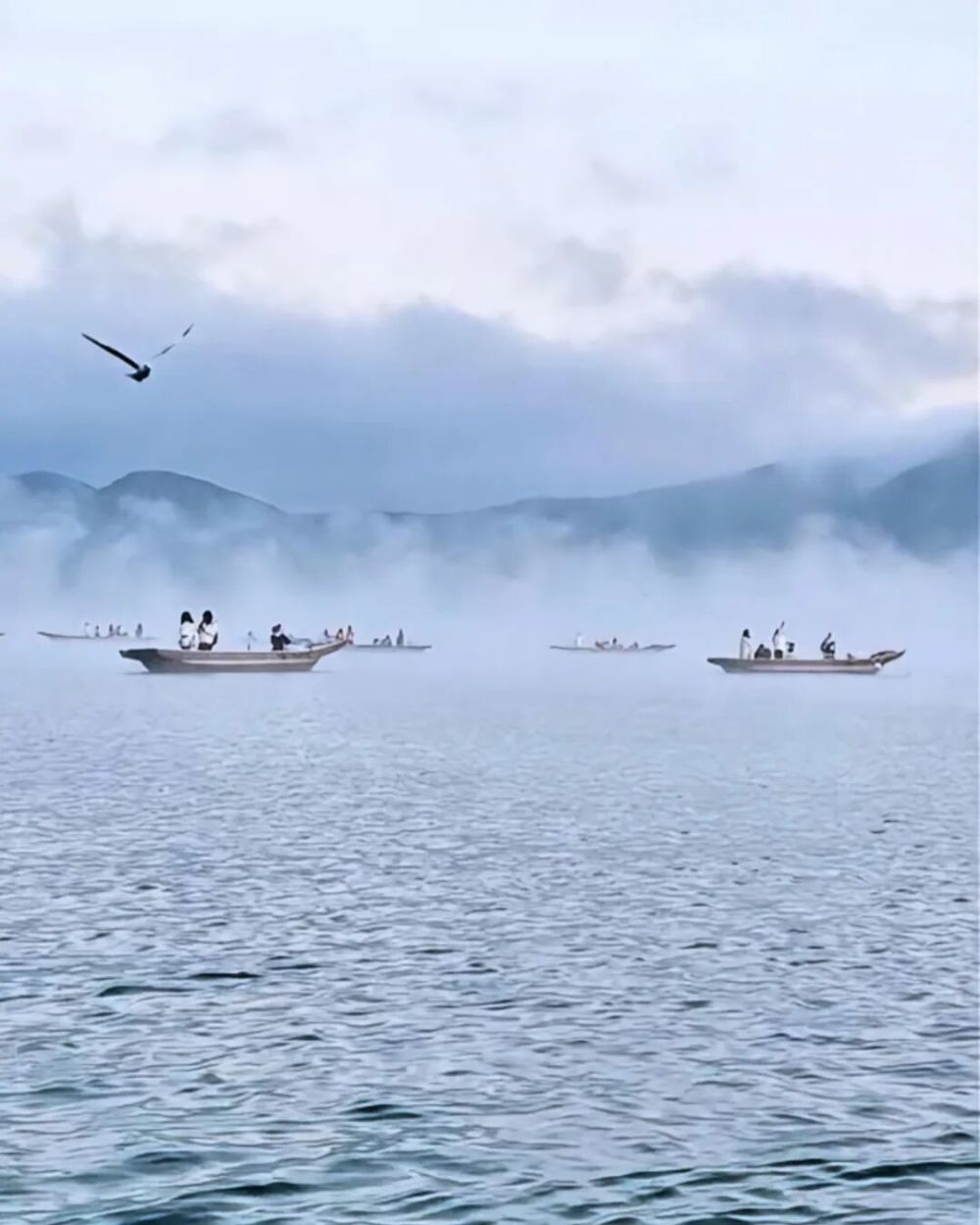 在這片靜謐中,成群的海鷗翩然起舞。它們潔白的羽翼劃破朦朧的霧氣,圍繞著湖中的豬槽船盤旋、鳴叫,為寧靜的畫卷注入了勃勃生機(jī)。移動(dòng)的船只、飛舞的鷗鳥與靜止的云霧、山影形成動(dòng)與靜的完美交融,成為攝影愛好者競(jìng)相追逐的焦點(diǎn)。