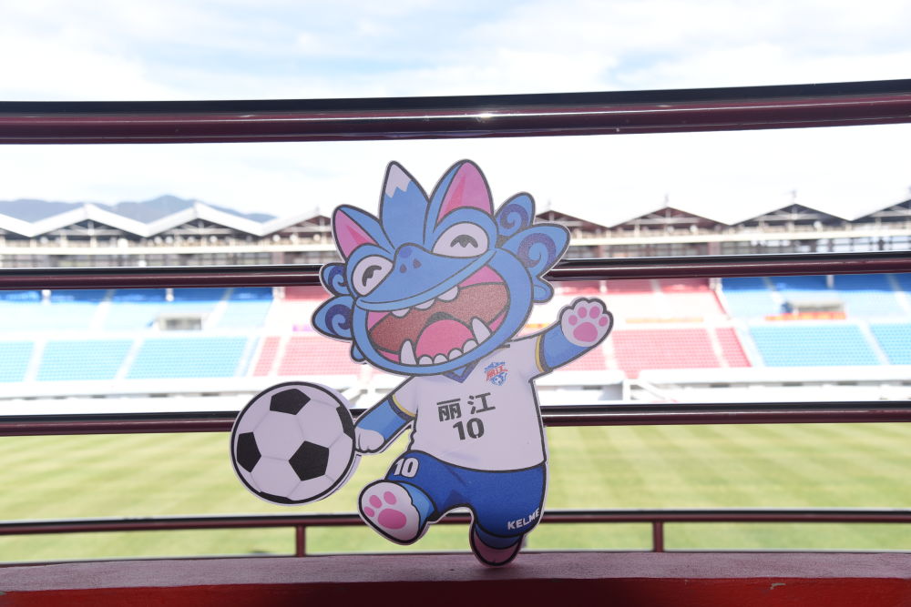 看臺(tái)上,布置了滇超聯(lián)賽吉祥物“嘯咪咪”展板。(麗江融媒記者 和玉松 攝)