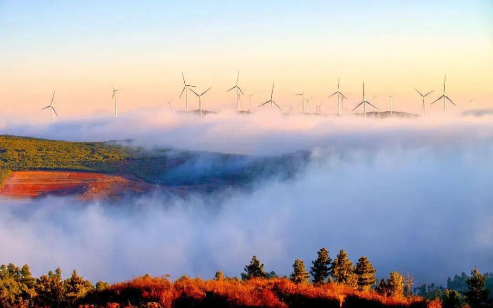 云霧中的風(fēng)力發(fā)電機組。康關(guān)福 攝