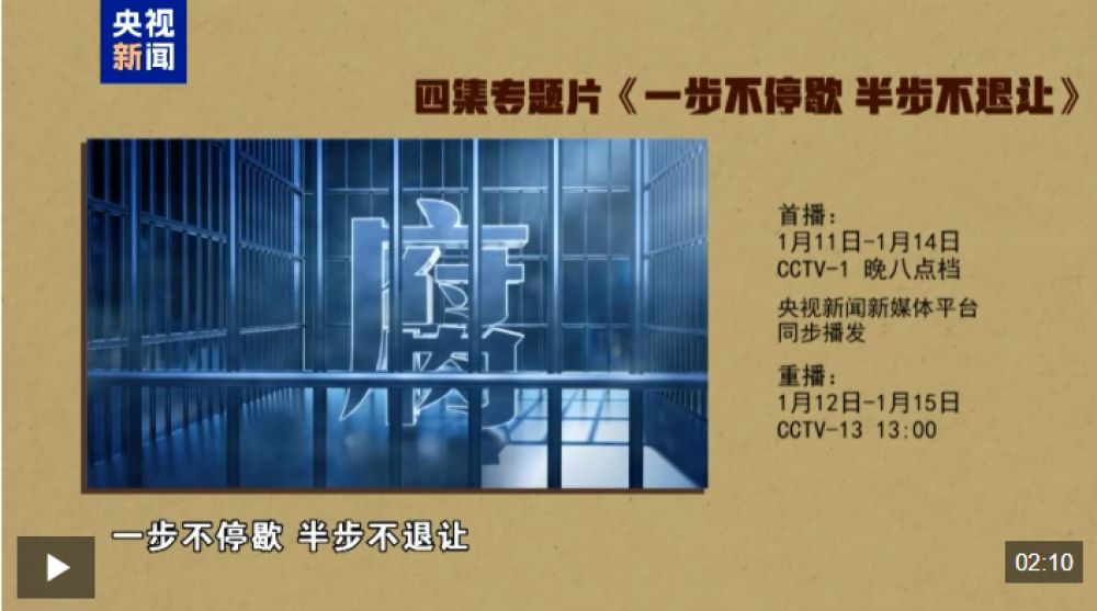 由中央紀(jì)委國家監(jiān)委宣傳部與中央廣播電視總臺央視聯(lián)合攝制的電視專題片《一步不停歇 半步不退讓》,將于1月11日至14日在中央廣播電視總臺央視綜合頻道晚8點檔播出,央視新聞新媒體平臺同步播發(fā)。