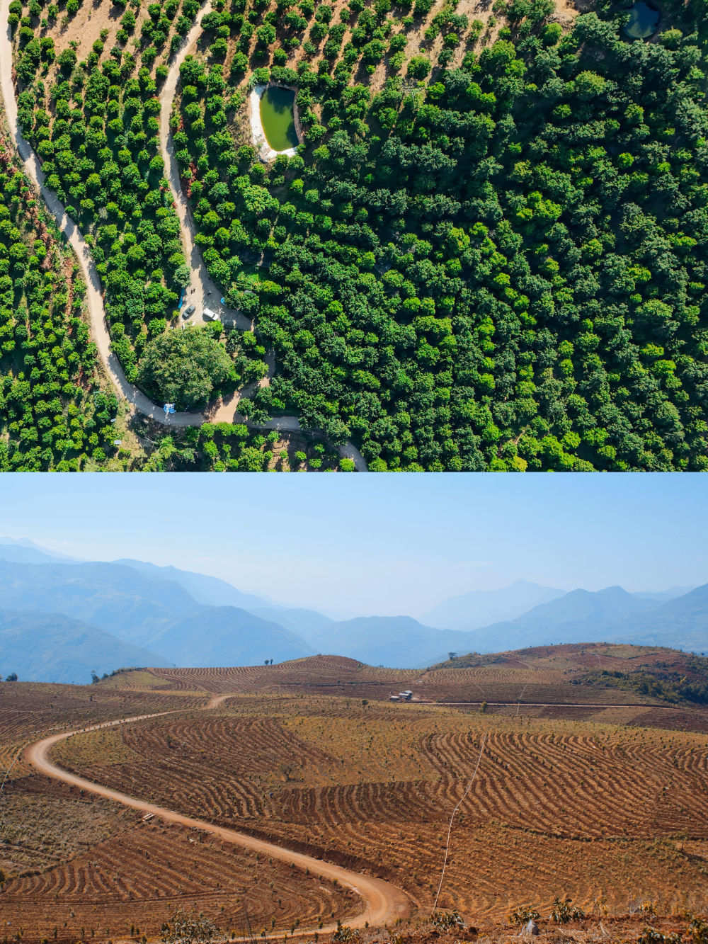 這是一張拼版照片。上圖:2026年1月6日拍攝的臨滄市永德縣堅(jiān)果樹種植林(無人機(jī)照片,新華社記者彭奕凱 攝);下圖:2001年拍攝的臨滄市永德縣早期堅(jiān)果樹種植林。(臨滄市委宣傳部供圖)
