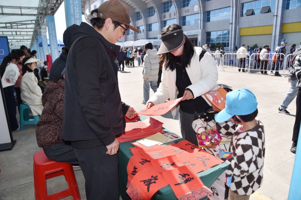市民和游客圍滿展臺,有的駐足欣賞書法創(chuàng)作,有的挑選心儀的春聯(lián),有的拿著剛寫好的春聯(lián)仔細(xì)端詳,現(xiàn)場一派熱鬧祥和?!翱辞蛸愡€能領(lǐng)春聯(lián),既有運(yùn)動的激情,又有過年的喜慶,太有意義了。” 剛領(lǐng)到春聯(lián)的市民王登明笑著說。