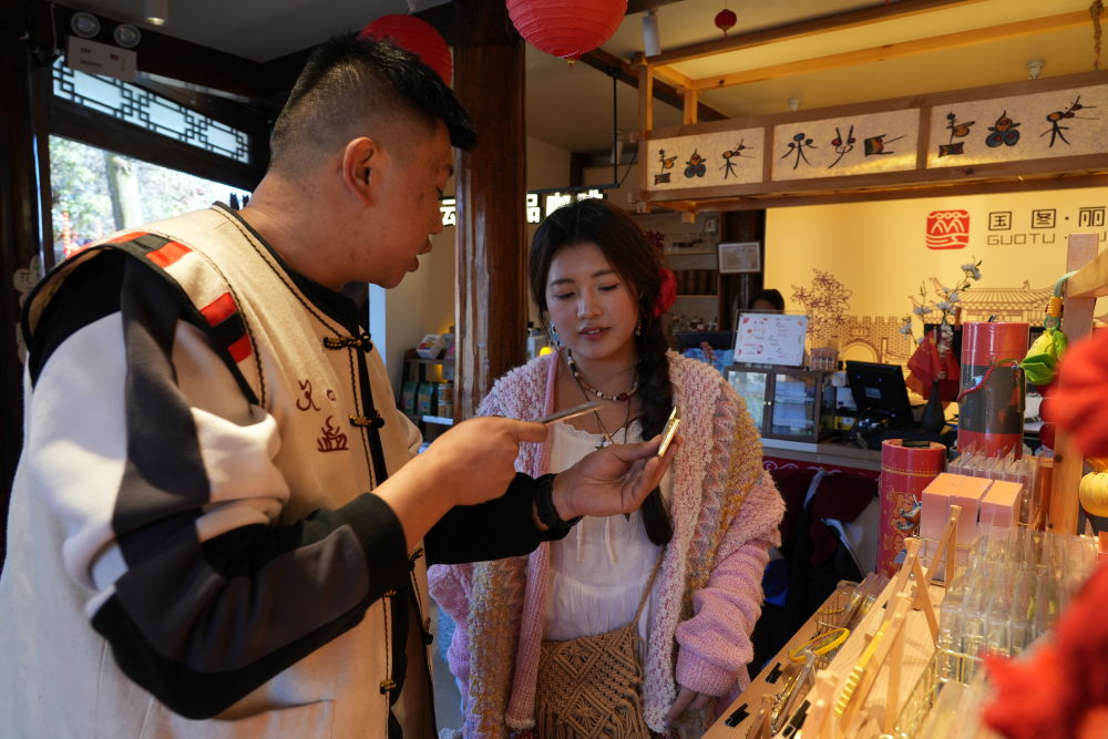 “每天進(jìn)來體驗(yàn)的游客很多。”國(guó)圖·麗江禮物新義店分店長(zhǎng)和釗介紹,通過沉浸式非遺體驗(yàn),讓客人在帶走麗江禮物的同時(shí),也能留住屬于麗江的美好回憶。